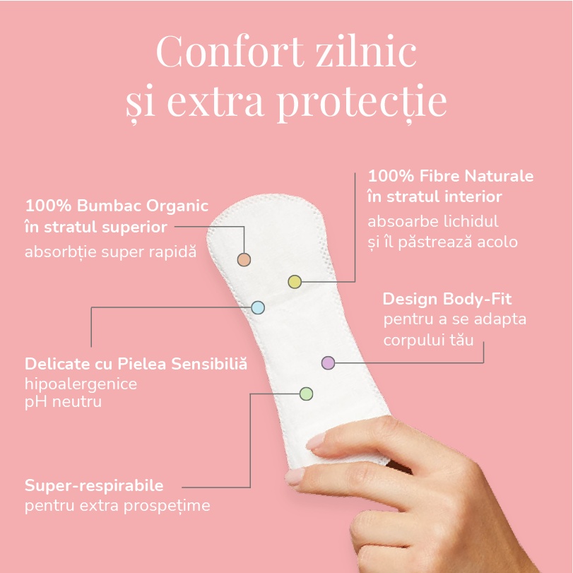 Proprietati:Absorbante zilnice 100% naturale, subțiri și confortabile create cu grijă pentru cea mai sensibilă parte a corpului oricărei femei. Având un strat superior din 100% bumbac organic și un nucleu natural super absorbant, protec-slipurile Enroush îți asigură protecția zilnică de care ai nevoie. – strat protector creat 100% din bumbac organic – nucleu absorbant inovativ din material sustenabil, pe bază de plante – ajustabile pentru diferite tipuri de lenjerie intimă – protecție superioară împotriva scurgerilor – hipoalergenic pentru piele sensibilă – pH neutru – testate și aprobate dermatologic