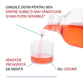 Mod de utilizare: De 2 ori pe zi, timp de 15 zile. Dimineata si seara, dupa periaj, umpleti paharul de masurare cu 15 ml de solutie pentru adulti sau 10 ml pentru copiii cu varste cuprinse intre 6 si 12 ani.
