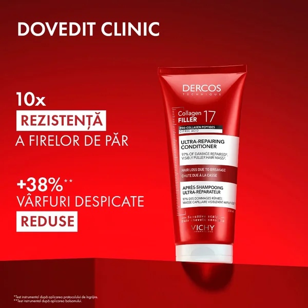 Descopera inovatia Dercos pentru un par puternic si plin de volum! Collagen 17 Filler este prima rutina ultra-reparatoare, imbogatita cu Peptide Pro-Colagen si Acid Citric, care actioneaza profund pentru a repara fibra capilara si a stimula productia naturala de Colagen 171.Balsamul Dercos Collagen 17 Filler, cu Peptide Pro-Colagen si Acid Citric, pentru fortifierea parului. Ofera pana la de 10 ori mai multa rezistenta a firelor de par2 si reduce cu pana la 38% varfurile despicate3. Repara fibra capilara si previne ruperea. Potrivit tuturor tipurilor de par, testat dermatologic.