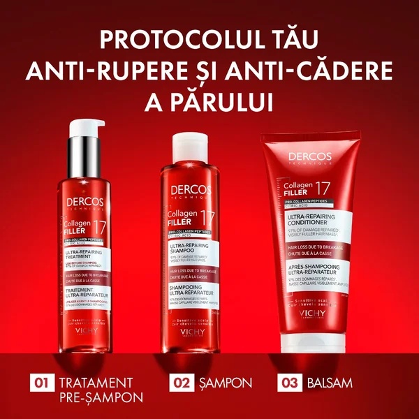 La baza inovatiei Dercos Collagen 17 Filler sta formula sa avansata, imbogatita cu Peptide Pro-Colagen si Acid Citric. Peptidele Pro-Colagen sunt ingredientul principal, conceput sa stimuleze direct productia naturala de Colagen 17*, esential pentru un par puternic si sanatos. Aceasta inovatie se materializeaza printr-un protocol complet care reduce eficient caderea parului cauzata de rupere si previne deteriorarea, oferind fibrei capilare o rezistenta sporita si un aspect revitalizat.