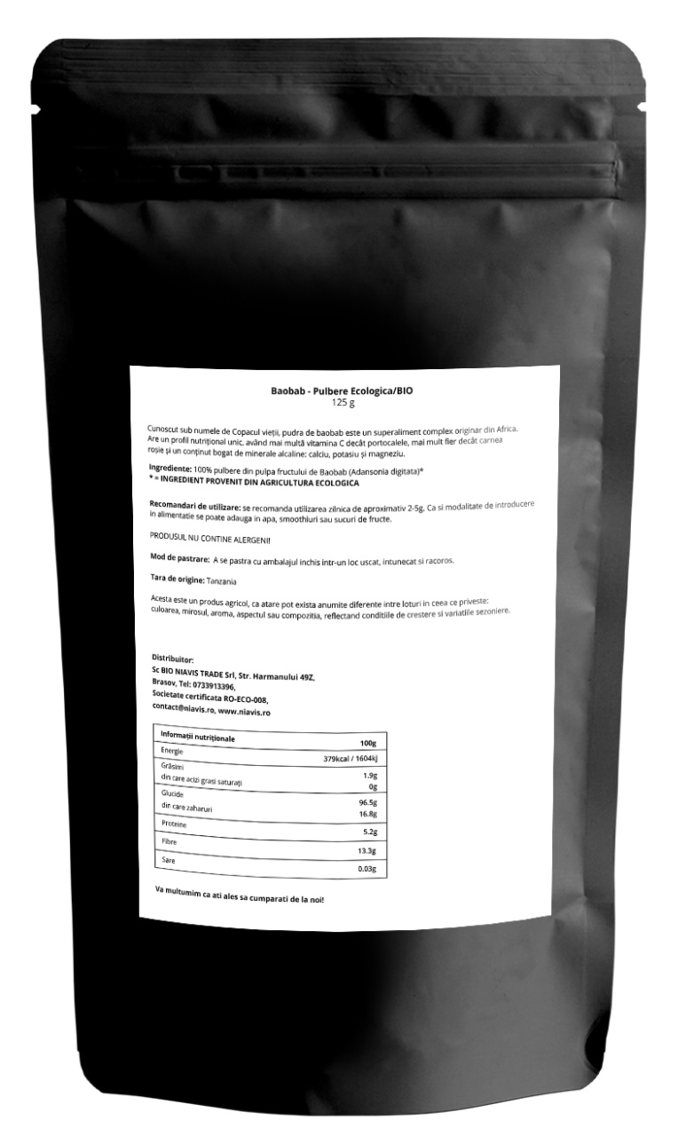 Baobabul pulbere ecologic de la Niavis este un superaliment exotic, obținut din fructele arborelui baobab, cunoscut și sub numele de „arborele vieții”, de cea mai înaltă calitate, cultivate ecologic fără utilizarea pesticidelor sau a altor substanțe chimice dăunătoare. Această pulbere fină și concentrată este ideală pentru a îmbunătăți valoarea nutritivă a diverselor preparate culinare și băuturi. Cu multiple beneficii pentru sănătate, baobabul pulbere este un supliment excelent pentru o dietă echilibrată și sănătoasă.