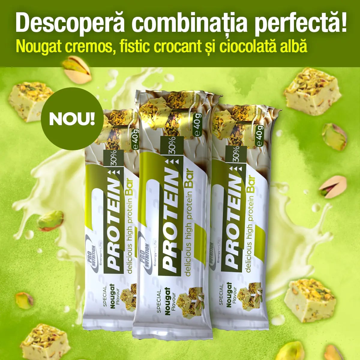 Fiecare baton conține 30% proteină de calitate și îmbină aroma fină de nougat cu savoarea fisticului. Alegerea ideală pentru momentele în care ai nevoie de energie și un gust deosebit!