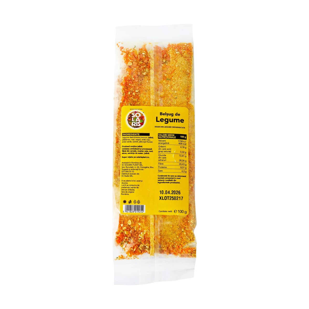 Belșug de Legume de la Solaris este un amestec natural de legume deshidratate și ierburi aromatice, ideal pentru a adăuga savoare preparatelor culinare. Formula fără adaosuri artificiale îl face potrivit pentru supe, ciorbe, tocănițe, garnituri sau sosuri, oferind un plus de gust într-un mod simplu și rapid.