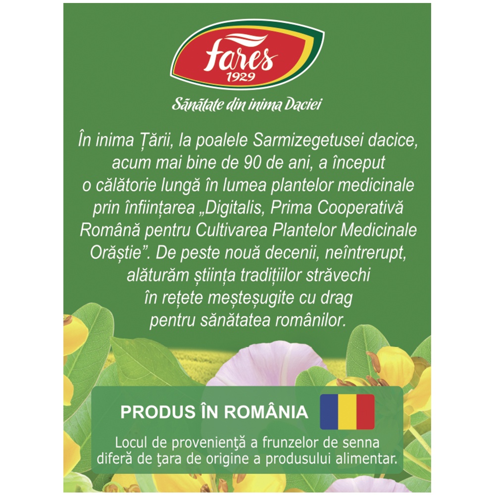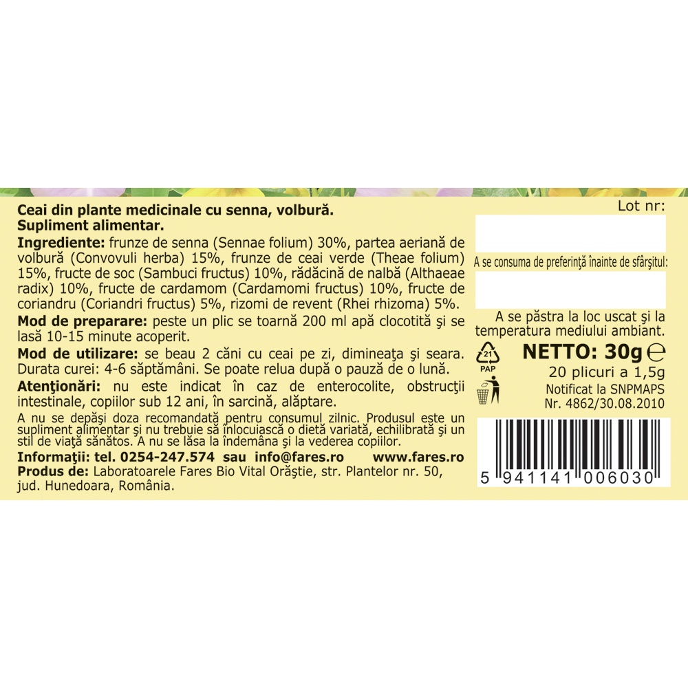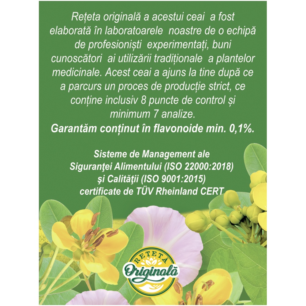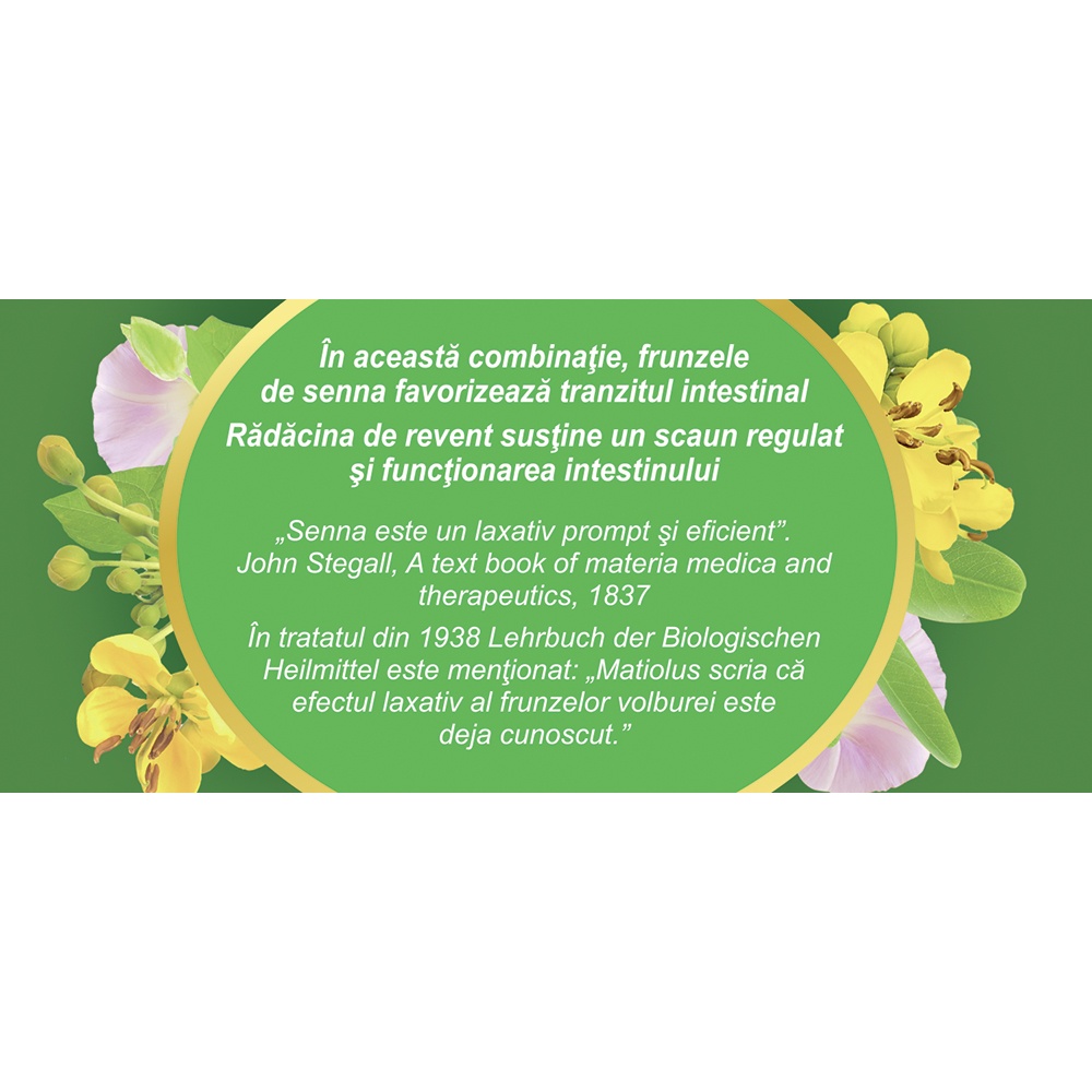 Proprietăți:În această combinație, frunzele de senna favorizează tranzitul intestinal. Rădăcina de revent reglează motilitatea intestinului și susține un scaun regulat.Ingrediente:Frunze de senna (Sennae folium), volbură (Convolvuli herba), frunze de ceai verde (Theae folium), fructe de șoc (Sambuci fructus), rădăcină de nalbă (Althaeae radix), fructe de cardamom (Cardamomi fructus), fructe de coriandru (Coriandri fructus), rizomi de revent (Rhei rhizoma).Acțiuni:Acest ceai are efect de eliminare a toxinelor și de curățare a colonului prin stimularea peristaltismului intestinal.Frunzele de senna și rădăcină de revent, datorită conținutului bogat în antrachinone, stimulează direct mucoasa intestinală, cresc motilitatea, inhibă absorbția de apă și electroliți, reducând astfel consistența scaunului.Volbură, fructele de șoc și nalbă determină evacuarea conținutului intestinal cu un scaun unic, neînsoțit de fenomene secundare, colici sau vărsături.Fructele de coriandru și cardamom au efect anticolitic și carminativ, favorizând eliminarea gazelor intestinale.Recomandări:Cure de detoxifiere, constipație.Contraindicații:Acest ceai nu este indicat în caz de enterocolite, obstrucții intestinale și copiilor sub 12 ani și în caz de hipersensibilitate la oricare dintre ingredientele produsului.Sarcină și alăptare:Acest ceai nu este indicat femeilor însărcinate și mamelor care alăptează.Mod de preparare:Peste un plic se toarnă 200 ml apă clocotită și se lasă 10-15 minute acoperit.Mod de administrare:Se beau 2 căni cu ceai pe zi, dimineața și seara.Durata unei cure este de 4 – 6 săptămâni.Cura se poate relua după o pauză de o lună.Prezentare: 20 plicuri