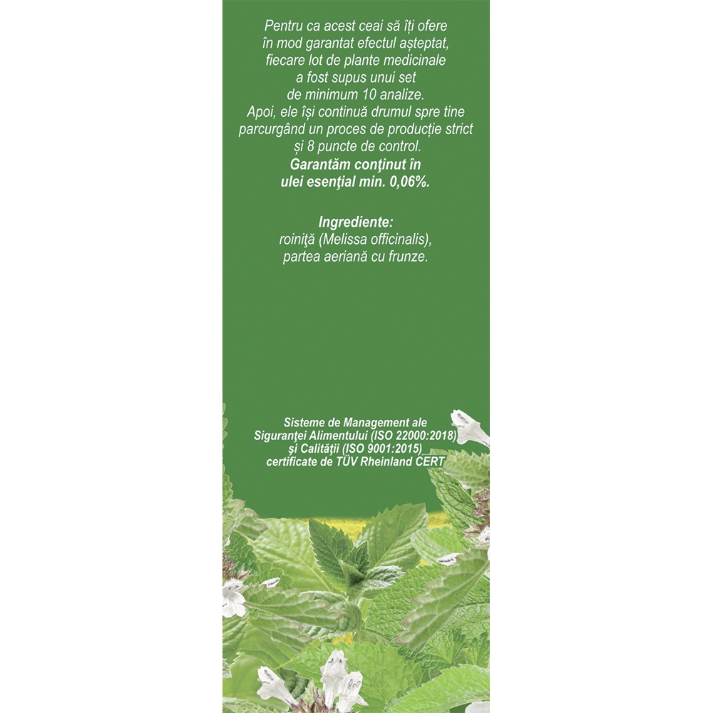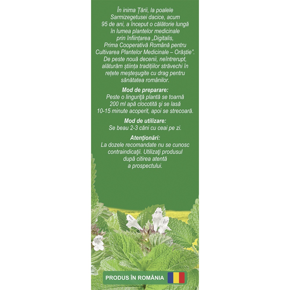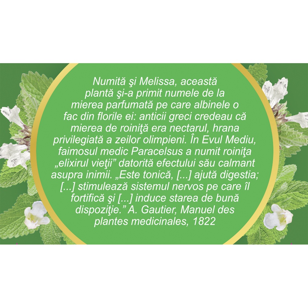 Ingrediente:Partea aeriană a plantei Melissa officinalis L., fam Lamiaceae, conține ulei volatil, acid cafeic, acid clorogenic, acid rosmarinic, flavonoide.