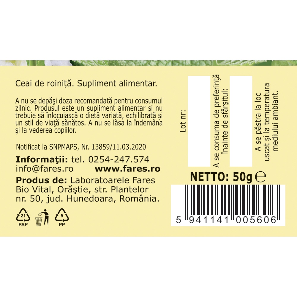 Mod de administrare:Se beau 2-3 căni cu ceai pe zi.Preparare:Infuzie din 1 linguriță plantă la o cană cu apă.