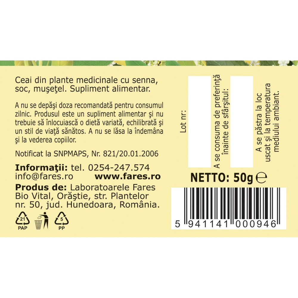Ingrediente:Frunze de senna, flori de mușețel, flori de șoc, sulfina, flori de lavandă, menta.Contraindicații:Diaree, deshidratare, copii sub 12 ani, hipersensibilitate la oricare dintre ingrediente.