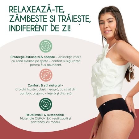 Chilotul menstrual înlocuiește cu succes absorbantele și tampoanele, fiind o soluție naturală, respirabilă, care protejează zona intimă de chimicale nedorite.