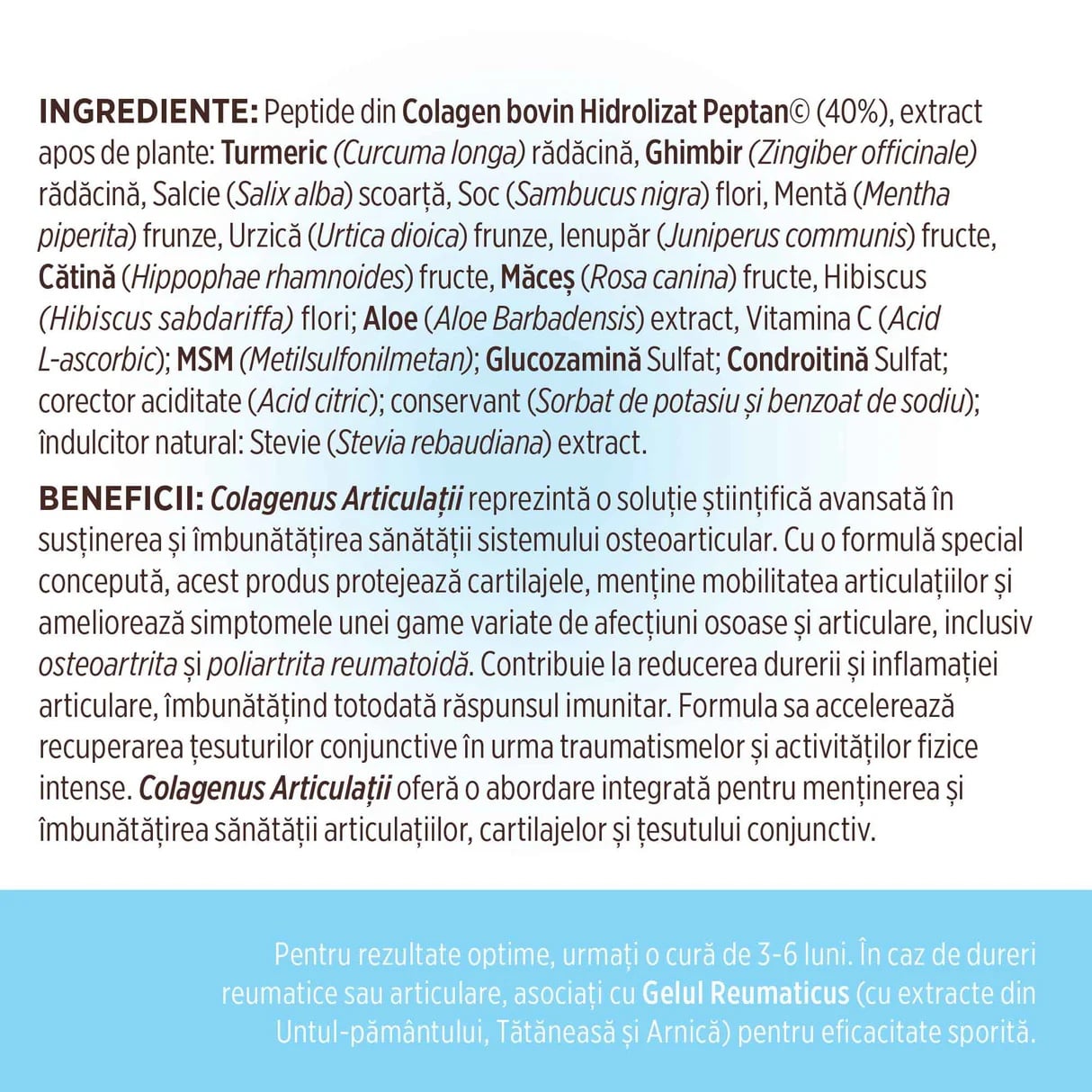 Conține colagen hidrolizat de tip I și II, cu grad ridicat de absorbție.