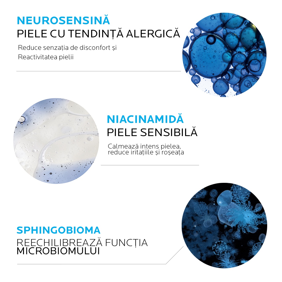 Ingrediente active:Sphingobioma, o fracție probiotică obținută din apa termală La Roche-Posay, ce ajută la echilibrarea microbiomului în această formulă concepută să reducă riscul de reacții ale pielii. Neurosensină, reduce senzaţia de disconfort. Reduce sensibilitatea şi reactivitatea pielii. Niacinamida, calmează intens pielea, reduce iritațiile și roșeața.