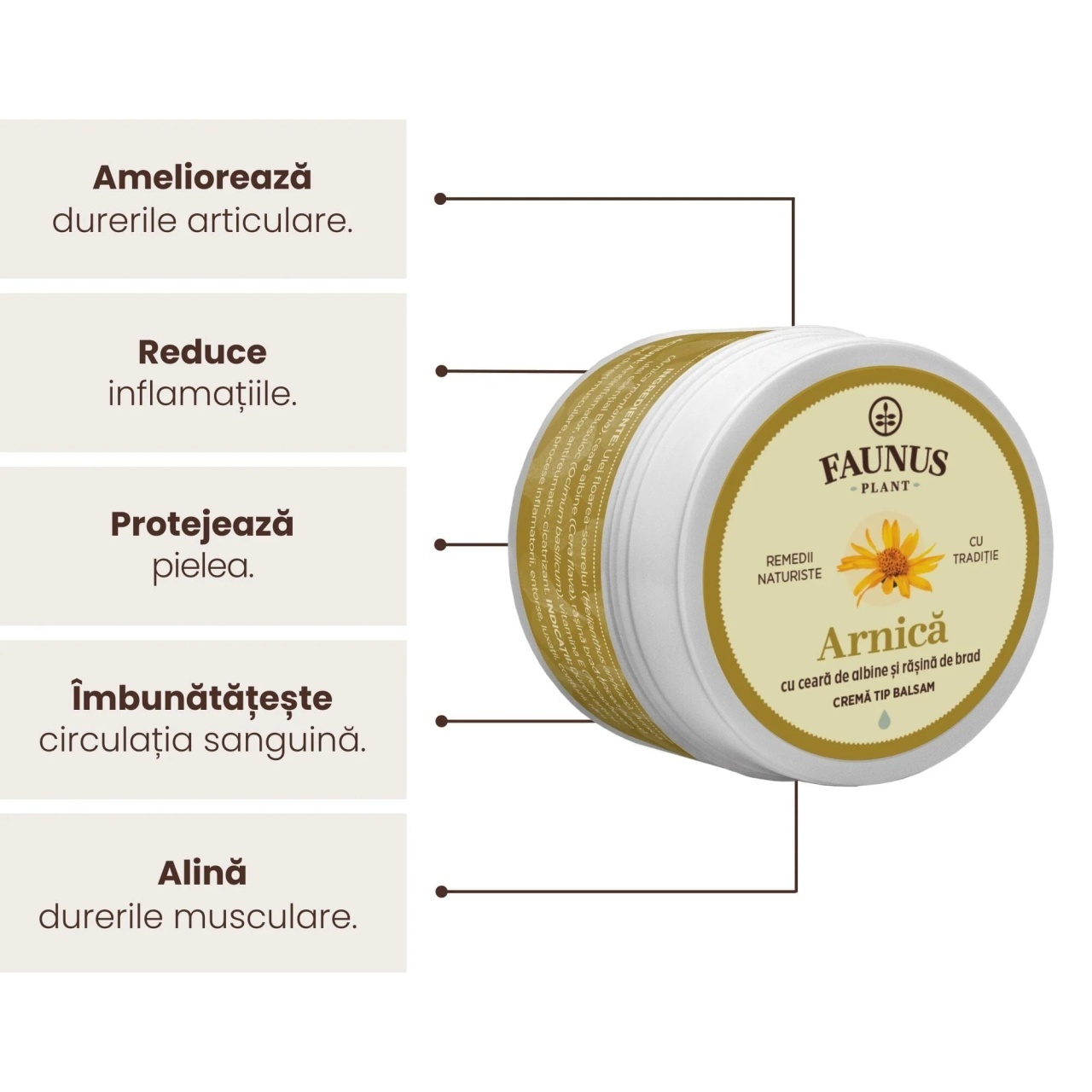Prezentare:Recipient cu 50 ml cremă tip balsam Arnica, Faunus Plant.