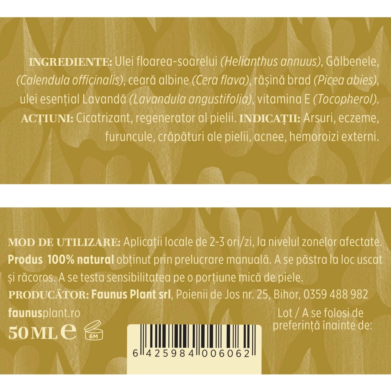 Ingrediente active:Extract de gălbenele, uleiuri vegetale, ceară naturală și ingrediente emoliente (conform etichetei producătorului).
