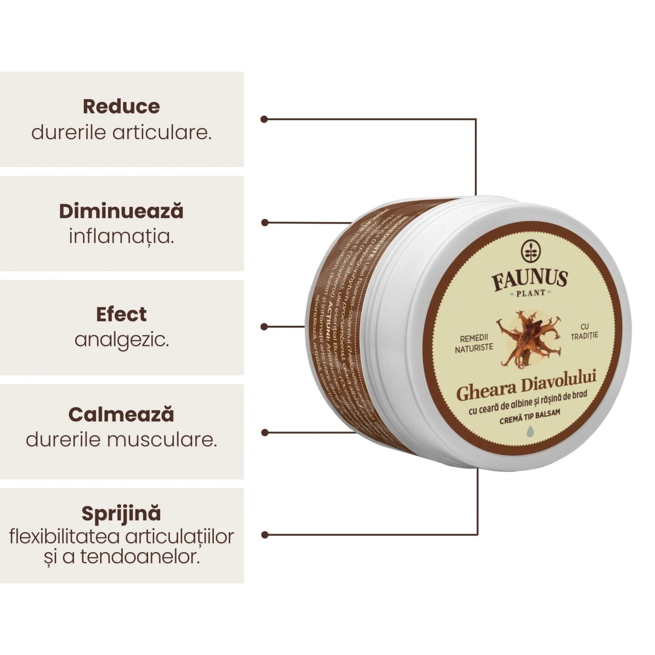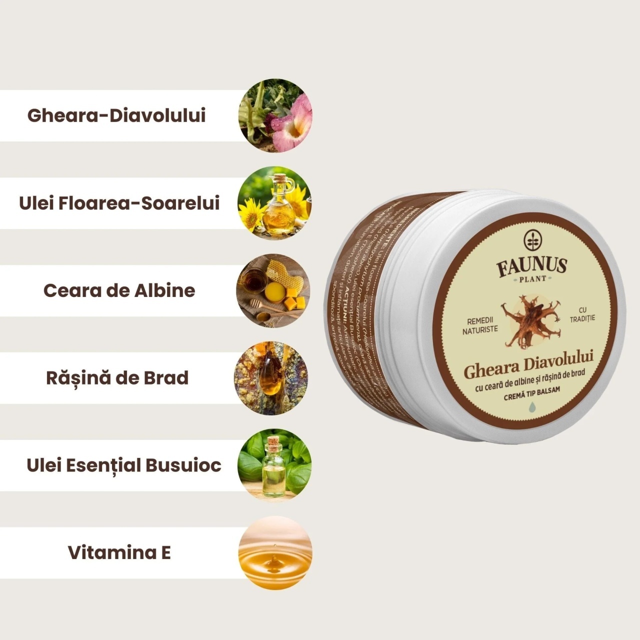 Crema tip balsam cu Gheara Diavolului de la Faunus Plant este un produs pentru uz extern, creat din ingrediente naturale, potrivit pentru îngrijirea locală a zonelor tensionate. Textura de balsam permite masarea ușoară și oferă o senzație plăcută de confort.