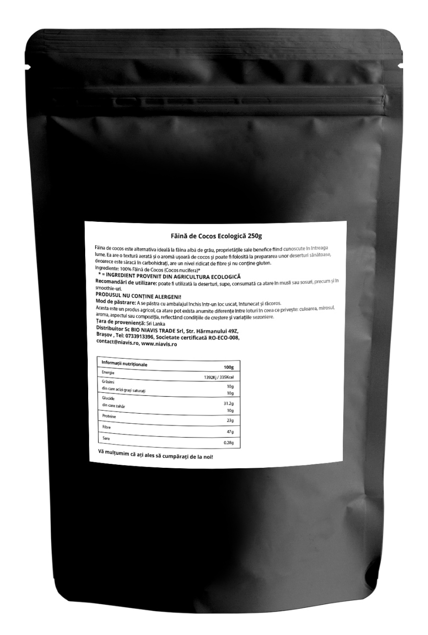 - Ambalaj practic: Punga de 250g este ușor de folosit și de depozitat, păstrând făina de cocos proaspătă și gata de utilizare.