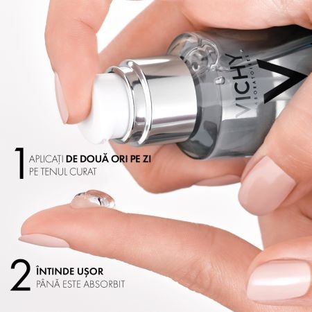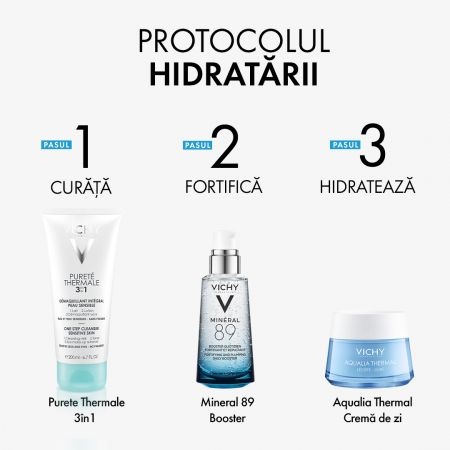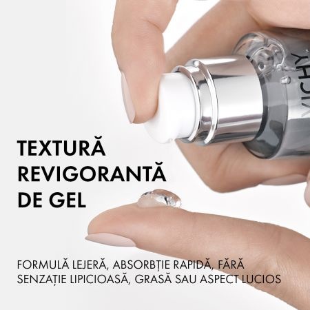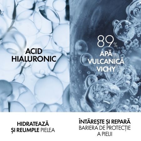Proprietăți:Pentru prima dată Vichy a reușit performanța de a concentra Apa Termală Mineralizantă în proporție de 89% într-o formulă revoluționară de îngrijire a feței alături de acidul hialuronic de origine naturală pentru un efect de hidratare, fortifiere și reumplere.- pentru un ten cu aspect sănătos și plin de luminozitate;- are efect de hidratare, fortifiere și reumplere cu acid hialuronic;- fortifiază pielea și o face mai rezistență împotriva agresiunilor externe cum ar fi poluarea, stresul său oboseala;- pentru toate tipurile de piele, inclusiv cea sensibilă;- se poate aplica și pe zona de contur a ochilor;- produs hipoalergenic, fără parfum, fără alcool.