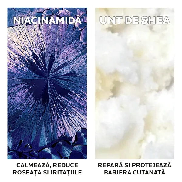 - conține Niacinamidă, pentru un efect calmant și Unt de Shea relipidant pentru a contribui la restaurarea barierei cutanate a pielii;