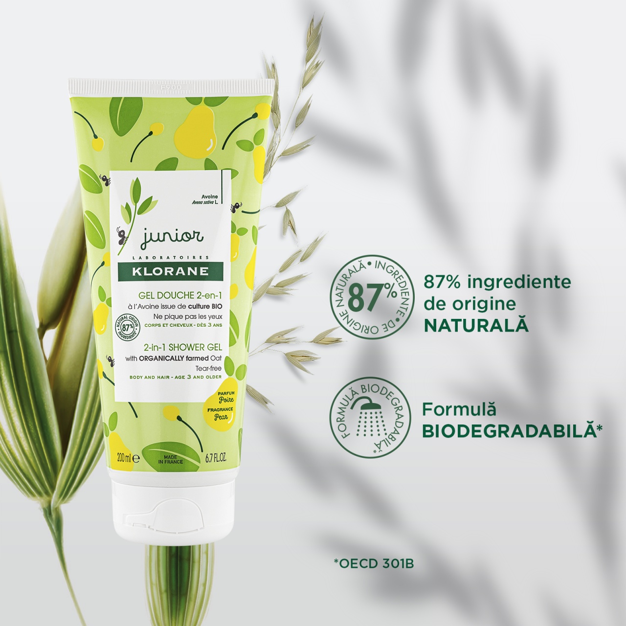 Proprietati:– curata delicat pielea și părul copiilor cu vârsta de minim 3 ani, fără a ustura ochii;- formula biodegradabilă cu toleranță ridicată pe copii este alcătuită din 87% ingrediente de origine naturală, inclusiv ovăz cultivat organic, acest ingredient activ este cunoscut pentru proprietățile sale calmante și este combinat cu agenți bogați în nutrienți pentru a înmuia pielea și părul fără a le altera echilibrul delicat;- textura delicata a gelului de duș 2 în 1 formează o spumă ușoară cu un parfum delicios de pere;- pielea este calmată și hrănită, iar părul rămâne strălucitor și suplu.