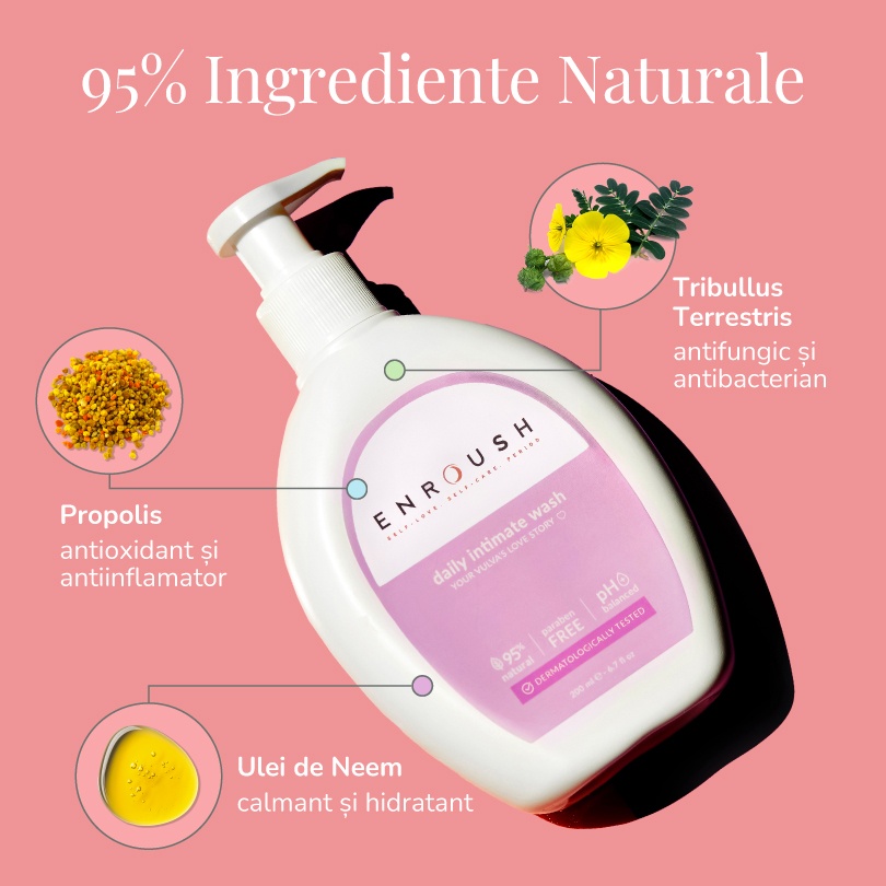Gelul Intim ENROUSH are o formulă unică – creată de medicii dermatologi și ginecologicu 95% ingrediente naturale: Tribulus Terrestris, propolis și ulei de Neem, potrivit chiar și pentru cea mai sensibilă piele! Păstrează echilibrul intim, menținând pH-ul neutru al pielii.