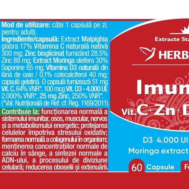 Imunocin cu Vitamina C, Zinc, Vitamina D3 si Moringa, 60 capsule, Herbagetica, este un supliment alimentar creat pentru a sustine functionarea normala a organismului prin aportul combinat de vitamine esentiale, minerale si extracte vegetale. Formula sa complexa contribuie la completarea nutrientilor necesari in perioade solicitante sau atunci cand alimentatia nu acopera necesarul zilnic.
