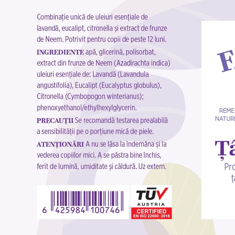Ingrediente:Apa, glicerina, polisorbat, extract din frunze de Neem (Azadirachta indica), uleiuri esentiale de: lavanda (Lavandula angustifolia), eucalipt (Eucalyptus globulus), citronella (Cymbopogon winterianus); phenoxyethanol / ethylhexylglycerin.