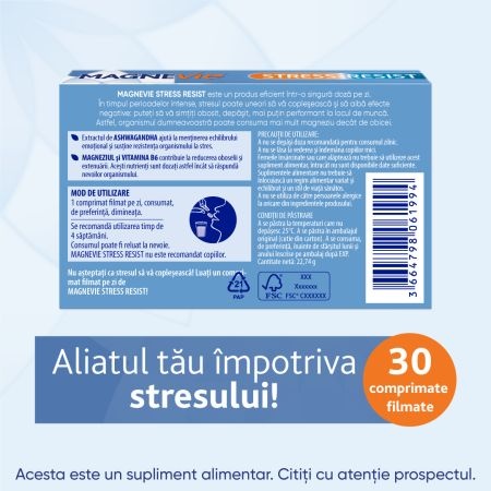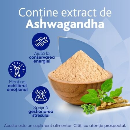 Proprietati:– in timpul perioadelor intense, stresul poate uneori sa va copleseasca si sa aiba efecte negative: puteti sa va simtit obosit, depasit, mai putin performant la locul de munca;- astfel, organismul dumneavoastra poate consuma mai mult magneziu decât de obicei;- extractul de Ashwagandha poate contribui la mentinerea echilibrului emotional si la sustinerea rezistentei organismului la stres;- Magneziul si Vitamina B6 poate contribui la reducerea oboselii si extenuarii;- acesti nutrienti sunt dozati astfel incât să răspundă nevoilor organismului.