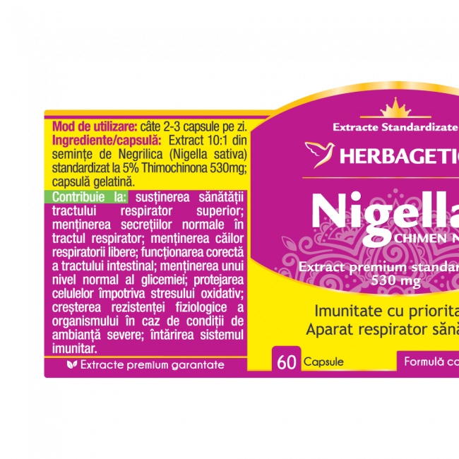 Nigella Chimen Negru, 60 capsule, Herbagetica, este un supliment alimentar pe baza de extract din semințe de Nigella sativa, cunoscut traditional pentru continutul sau natural de compusi vegetali valorosi. Produsul ofera o sursa concentrata de fitonutrienti, fiind potrivit pentru persoanele care doresc sa completeze aportul de substante active din plante.