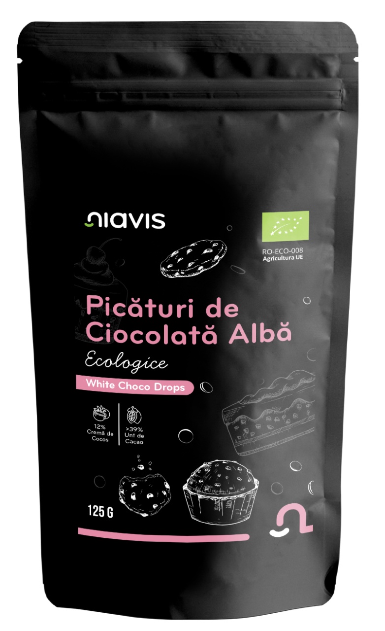 Picăturile de ciocolată albă Niavis sunt alegerea ideală pentru deserturi cremoase, rafinate și 100% naturale. Obținute din ingrediente certificate ecologic, acestea oferă un gust bogat, dulce și o textură fină, perfectă pentru orice preparat – de la biscuiți și prăjituri, până la creme și sosuri.