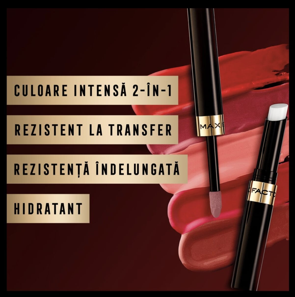 Rujul de buze Max Factor Lipfinity este produsul iconic, modernizat, de o rezistenta indelungata, ce ofera 2 pasi spre buze atragatoare. Este modalitatea perfecta de a face o impresie memorabila. Rujul de buze Lipfinity – nuante fascinante, ce rezista intreaga zi. Fa-te remarcata cu nuante bogate care rezista pana la 24 de ore.