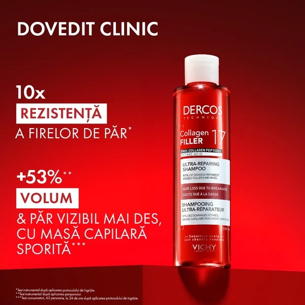 Samponul Dercos Collagen 17 Filler, cu Peptide Pro-Colagen si Acid Citric, pentru fortifierea parului. Ofera pana la de 10 ori mai multa rezistenta a firelor de par2 si pana la +53% volum3 cu o masa capilara sporita4. Repara parul deteriorat si previne caderea cauzata de rupere. Potrivit tuturor tipurilor de par, testat dermatologic.