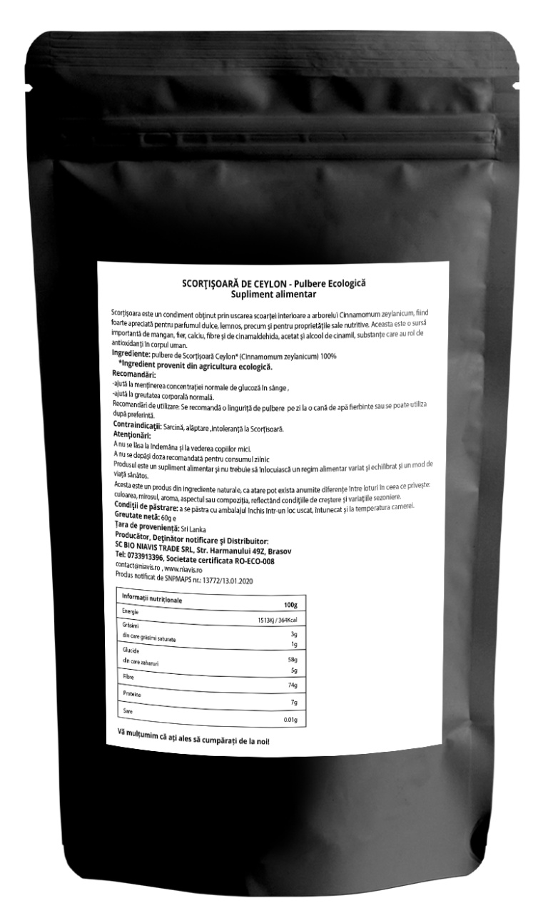 Ingrediente: pulbere de Scortisoara Ceylon* (Cinnamomum zeylanicum) 100%    *Ingredient provenit din agricultura ecologica.