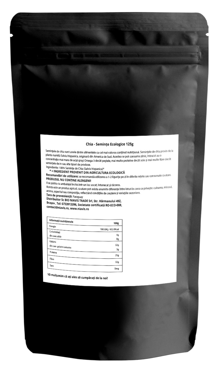 INFORMATII NUTRITIONALE / 100gEnergie ……………452.0kcal/1863.0kjCarbohidrati……… 4g      din care zahar………0gGrasimi………………………….. 32g      din care grasimi saturate ……….3gProteine ………….21gFibre ………………..32gSare ………………….0gINGREDIENTE: 100% seminte de Chia*     * = INGREDIENT PROVENIT DIN AGRICULTURA ECOLOGICAPRODUSUL NU CONTINE ALERGENI!Recomandari de utilizare: se folosesc la prepararea de budinci pe baza de lapte simplu sau vegetal, precum cel de cocos sau orice alte nuci sau seminte alaturi de fructele preferate. Se mai pot aduca la cerealele de la micul dejun, in checuri, clatite, briose. Impreuna cu uleiuri de masline si ceapa rosie tocata marunt se prepara asa numitele icre vegane care aduc la gust perfect cu icrele din peste. Si nu in ultimul rand se pot adauga la bilute energizante, batoane proteice sau in smoothie-ul preferat.Acesta este un produs agricol, ca atare pot exista anumite diferente intre loturi in ceea ce priveste: culoarea, mirosul, aroma, aspectul sau compozitia, reflectand conditiile de crestere si variatiile sezoniere.Tara de provenienta:IndiaGramaj: 125g