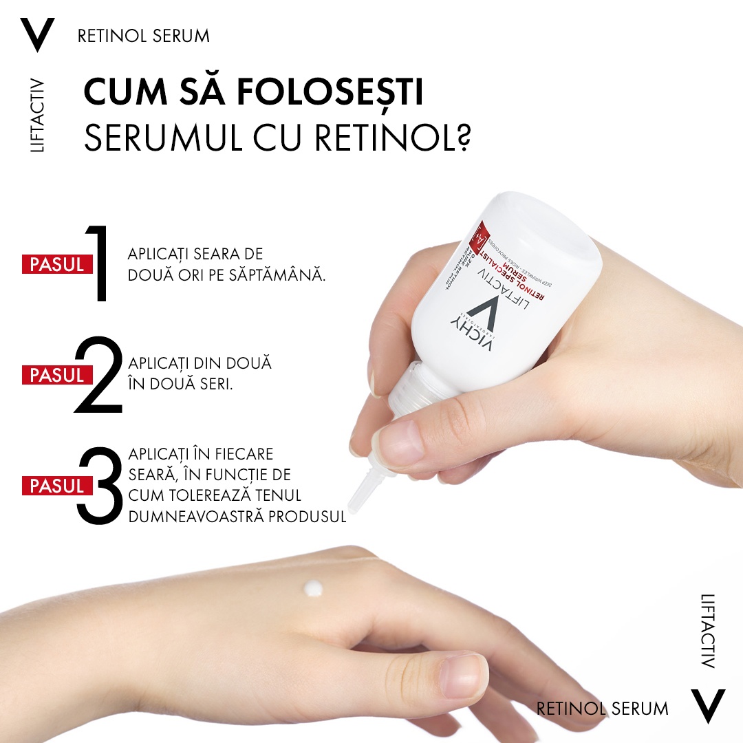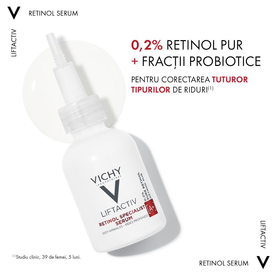 Proprietati:– odată cu înaintarea în vârstă și cu agresiunile externe prezente, stimularea producției celulare scade, iar ridurile devin mai proeminente; – produsul are efect de regenerare și corectează toate tipurile de riduri, chiar și cele mai pronunțate;- oferă tenului un aspect neted și luminos; – contine 0,2% Retinol Pur – derivat din Vitamina A ce stimuleaza productia celulara, contribuie la reducerea liniilor fine, ridurilor si petelor pigmentare, in timp ce sporeste netezimea, densitatea si fermitatea;- contine 1% Fracții Probiotice – fractiile probiotice sunt un activ proprietar al Vichy care are putere de regenerare si care ajuta la atenuarea efectelor secundare ale retinolului;- fracțiile probiotice alaturi de retinolul pur, actioneaza in sinergie pentru o eficacitate antirid.
