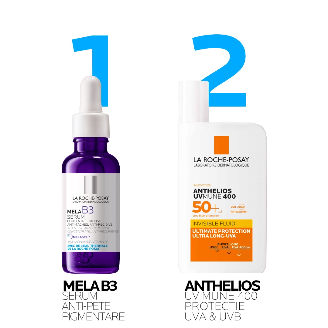 Mela B3 de la La Roche-Posay este un ser concentrat intensiv care oferă o soluție inovatoare pentru corectarea și prevenirea petelor pigmentare. Cu rezultate vizibile în doar o săptămână, acest ser este formulat pentru a combate eficient petele persistente și a uniformiza tonul pielii. Ingredientul activ patentat Melasyl™ interceptează excesul de melanină, prevenind deteriorarea pielii, în timp ce Niacinamida fortifică bariera cutanată și calmează pielea. Indiferent de cauza petelor pigmentare – foto-îmbătrânire, expunere solară, post-acnee sau cicatrici – Mela B3 este testat clinic pentru a aduce îmbunătățiri semnificative, fiind non-comedogenic și tolerat excelent chiar și de pielea sensibilă.