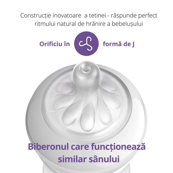 - Tetina Natural Response – Tetina Natural Response urmeaza ritmul natural de hranire al bebelusului, facilitand combinarea hranirii la san cu hranirea cu biberonul. Tetina are un orificiu unic care elibereaza lapte numai atunci cand bebelusul suge in mod activ. Astfel ca fluxul de lapte se opreste atunci cand bebelusul se opreste din supt pentru a inghiti si respira.