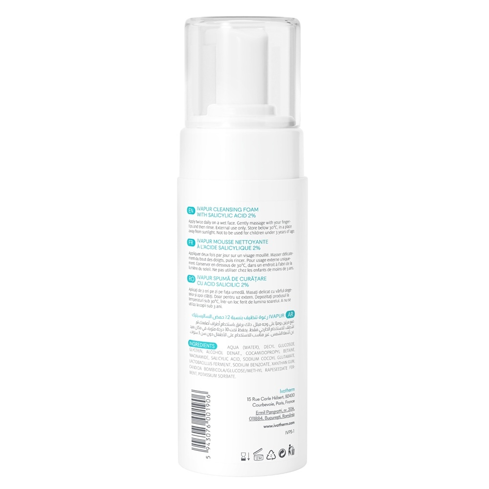 Spuma de curatare cu Acid Salicilic 2% pentru pielea mixta sau grasa cu tendinta acneica Ivapur, 160 ml, Ivatherm