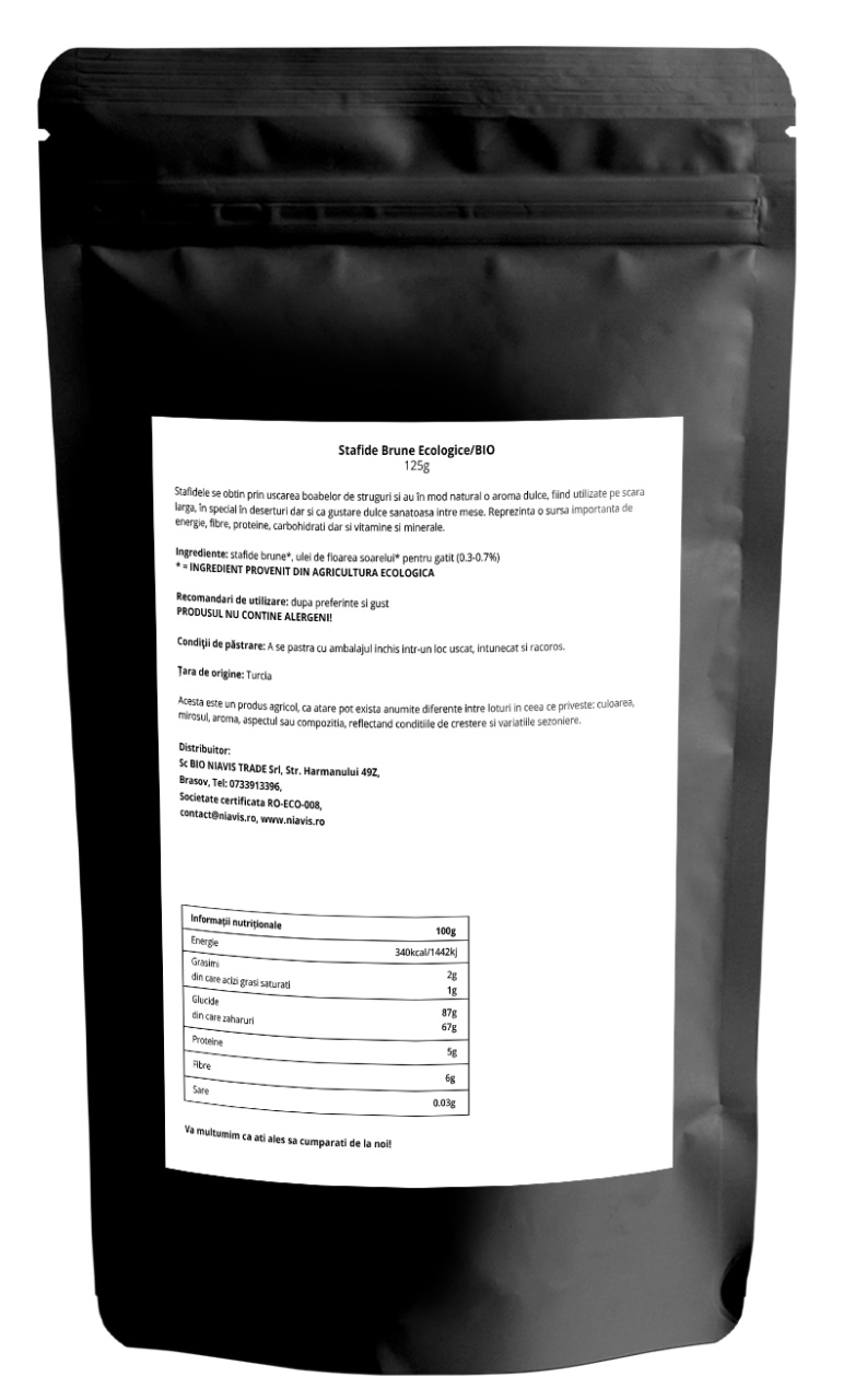 Stafidele brune ecologice Niavis sunt obținute din struguri cultivați ecologic, uscați natural și fără adaos de zahăr sau conservanți. Sunt o gustare nutritivă, 100% naturală, bogată în energie, fibre și micronutrienți esențiali.