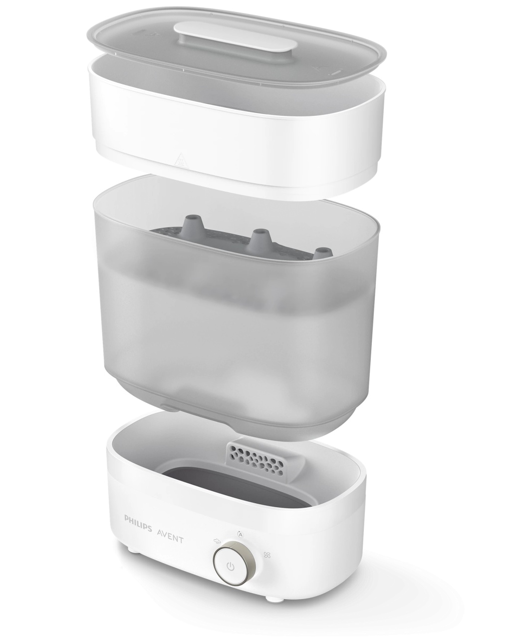 Sterilizatorul nostru electric premium nu doar curăţă biberoanele şi distruge germenii, ci şi usucă şi depozitează biberoanele şi accesoriile, menţinându-le sterile timp de până la 24 de ore.