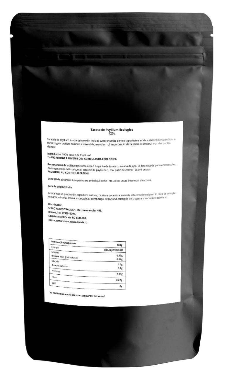 • 100% Ecologice: Produsul este certificat ecologic, garantând că tărâțele de psyllium sunt cultivate fără pesticide și alte substanțe chimice dăunătoare.