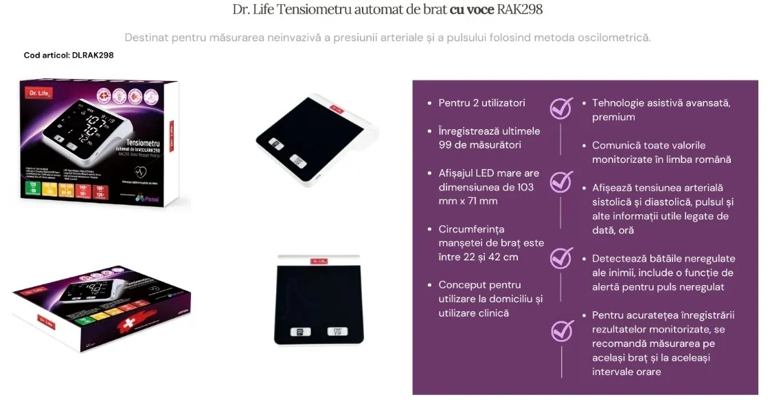 Tensiometrul DLRAK298 reprezintă un sistem de monitorizare extraordinar, de ultimă generație, care combină tehnologia asistivă avansată cu un ecran LCD generos și funcție de voce în limba română, oferind o experiență completă și intuitivă. Acesta afișează și comunică clar toate valorile măsurate – tensiunea arterială sistolică și diastolică, pulsul și semnalele de alertă – transformând monitorizarea sănătății într-un proces precis, sigur și ușor de utilizat pentru orice utilizator.