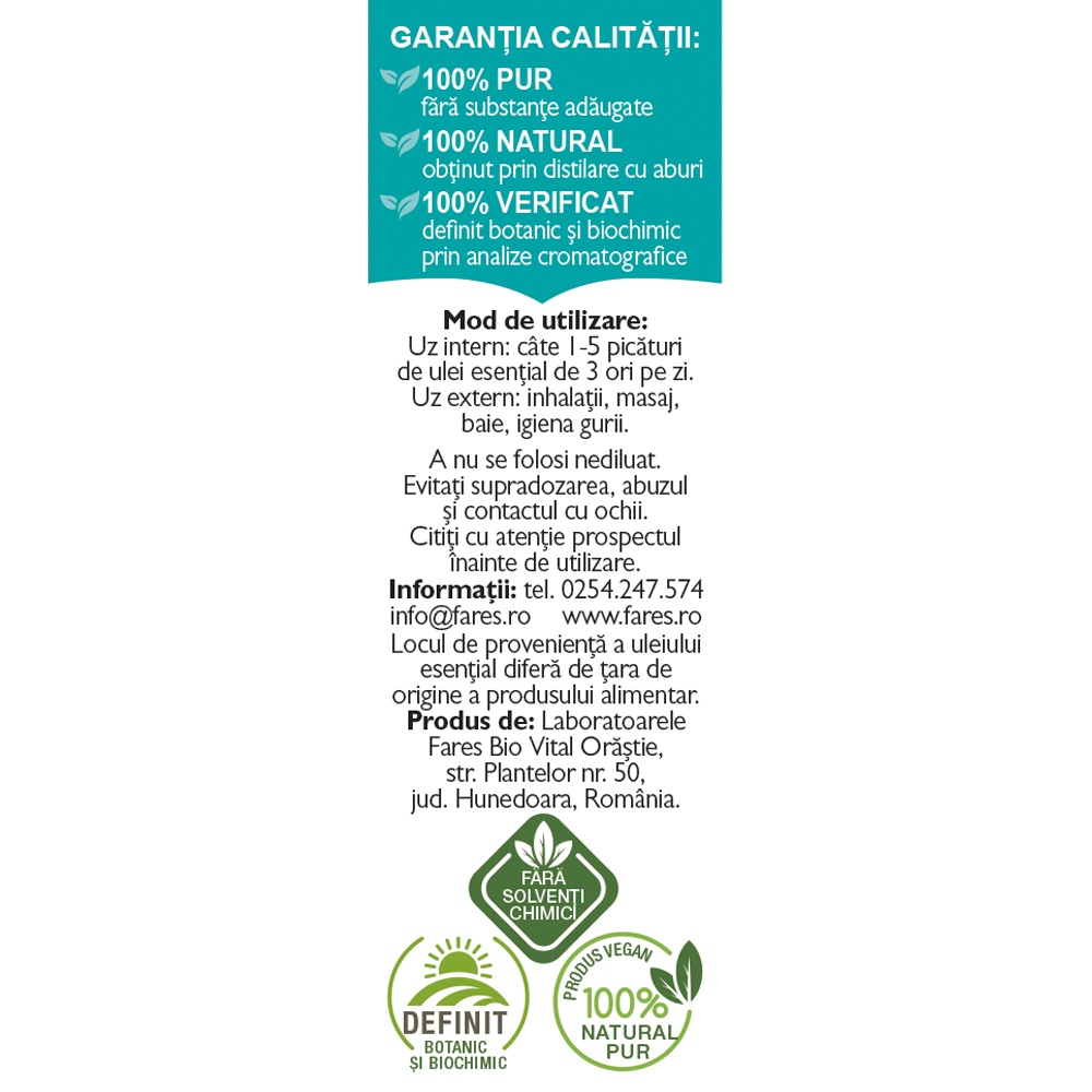 Precautii:Nu se folosește nediluat.În uz extern, nu se recomandă copiilor sub 3 ani. Nu se va aplica pe față la copii sub 10 ani. În sarcină și alăptare se va utiliza doar la nevoie, sub formă de inhalații și nu mai mult de 5 zile.Evitați supradozarea, abuzul și contactul cu ochii.