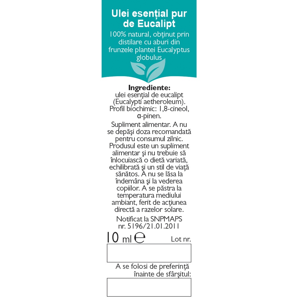 Proprietati:– 100% pur, nu este amestecat cu alte uleiuri esențiale sau componente sintetice, cu uleiuri vegetale grase sau uleiuri minerale, fără solvenți chimici;- 100% natural, obținut prin distilare cu aburi;- 100% verificat, definit biochimic și botanic, constă în cunoașterea exactă a speciei plantei aromatice din care se obține uleiul esențial și determinarea precisă, prin analize cromatografice, a constituenților biochimici cu desemnarea componentului majoritar;- profil biochimic: 1,8-cineol, α-pinen.are activitate antibacteriană împotriva bacteriilor care cauzează probleme ale tractului respirator;- 1,8-cineolul, componentul principal al uleiului, are proprietăți antiseptice;- ajută la liniștirea iritațiilor gâtului și faringelui și exercită un efect calmant și plăcut asupra gâtului și corzilor vocale;- ajută în răceală și tuse;ușurează respirația și sprijină decongestionarea și eliberarea căilor nazale;- contribuie la sănătatea articulațiilor și confortul muscular;- utilizat extern ajută în caz de oboseală mentală, stres.