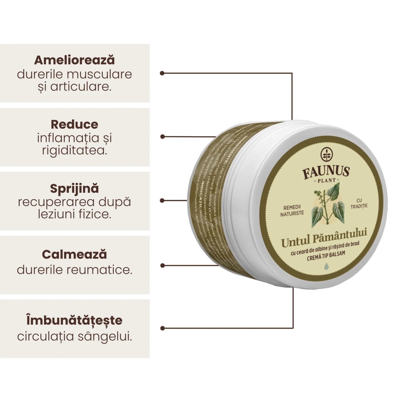 Unguentul Untul Pământului de la Faunus Plant este un produs tradițional pentru uz extern, realizat din extracte naturale și ingrediente vegetale alese pentru îngrijirea locală a zonelor tensionate. Formula sa concentrată oferă o aplicare ușoară și poate fi utilizată ca parte a rutinei de îngrijire corporală.