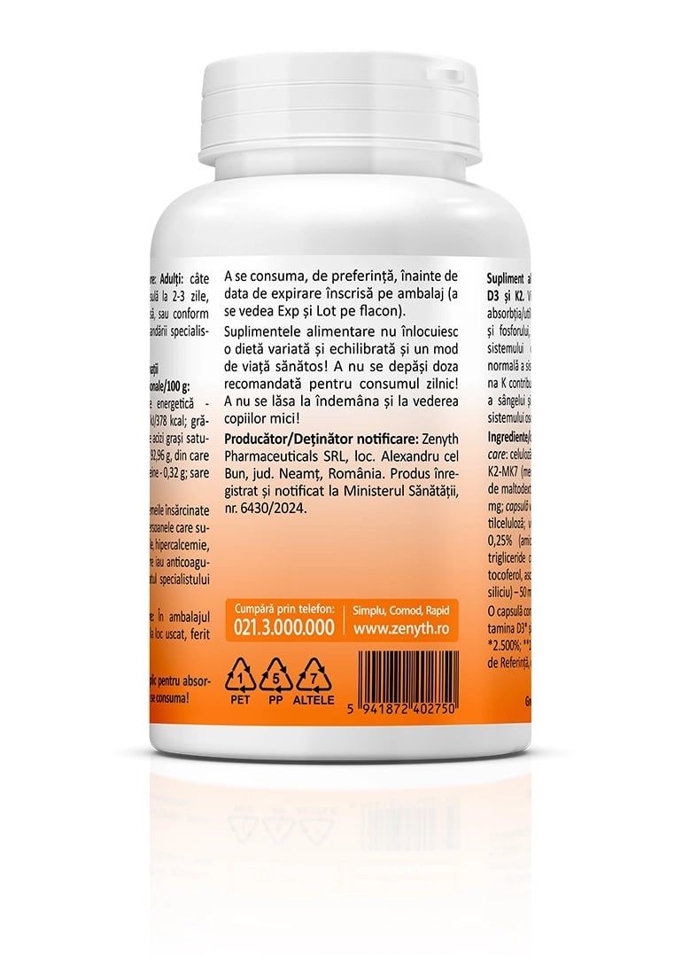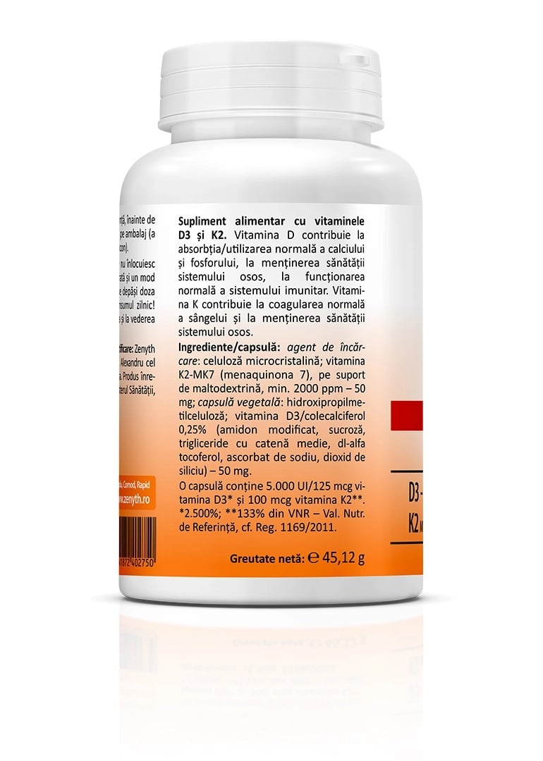 O capsulă conține 5000 UI D3 (2500% VNR*) și 100 mcg K2 (133% VNR*). (* Valori nutriționale de Referință cf. Reg. 1169/2011).