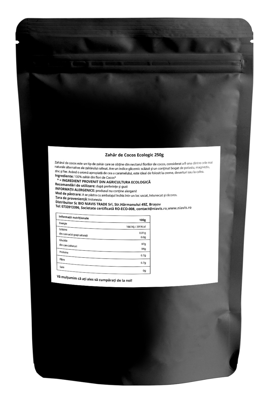 Zahărul de cocos ecologic Niavis este un îndulcitor natural obținut din nectarul florilor de cocos, considerat o alternativă mai puțin procesată față de zahărul rafinat. Are o aromă caldă, cu note de caramel, fiind ideal pentru deserturi, cafea, ceai sau rețete de patiserie. Produsul este 100% ecologic și nu conține gluten.