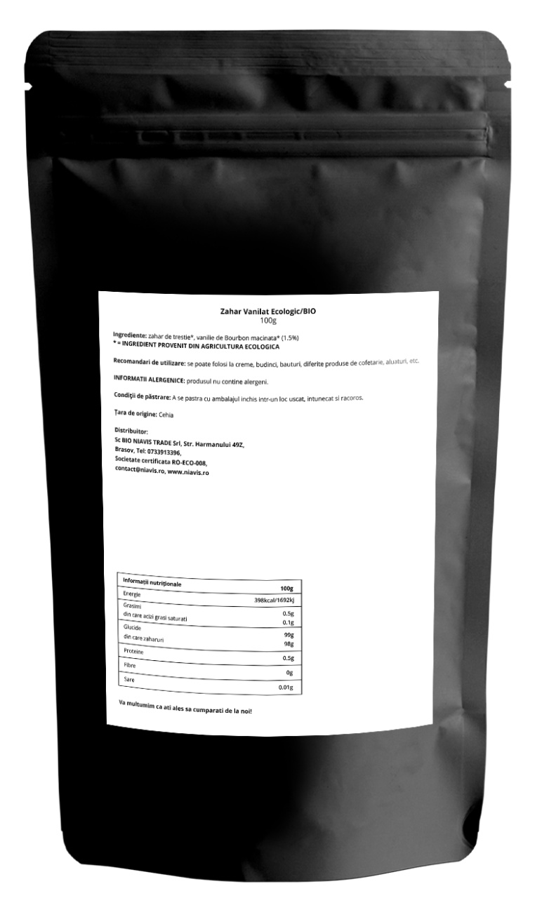 - Puritate și Calitate: Zahărul vanilat de la Niavis este fabricat din ingrediente 100% ecologice, fără adaosuri artificiale sau conservanți.